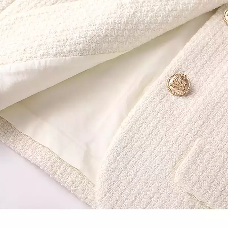 Detalhes Dourados que Encantam: Os botões frontais e os detalhes nos bolsos em tom dourado adicionam um brilho sutil e sofisticado, elevando o casaco a um novo patamar de luxo.