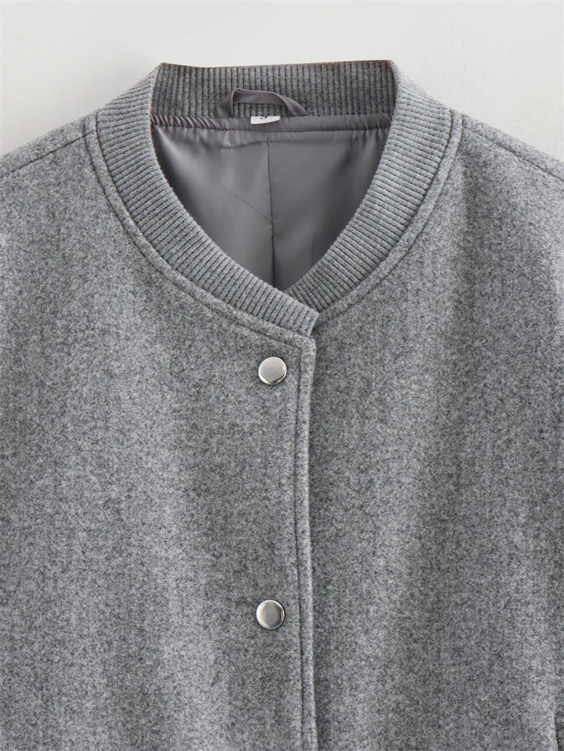 O design icônico da jaqueta bomber se destaca com a gola, punhos e barra em acabamento canelado e elástico, que proporcionam ajuste perfeito e um toque esportivo-chique. O fechamento frontal com botões de pressão discretos e os bolsos laterais profundos combinam funcionalidade com um visual clean e moderno.
