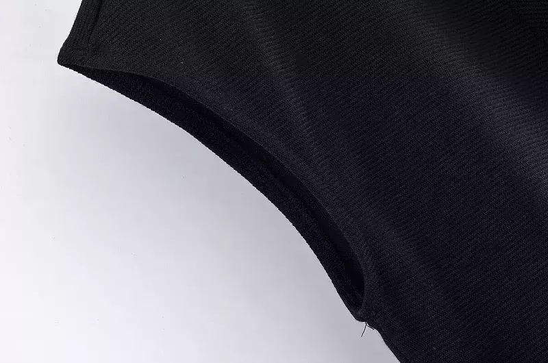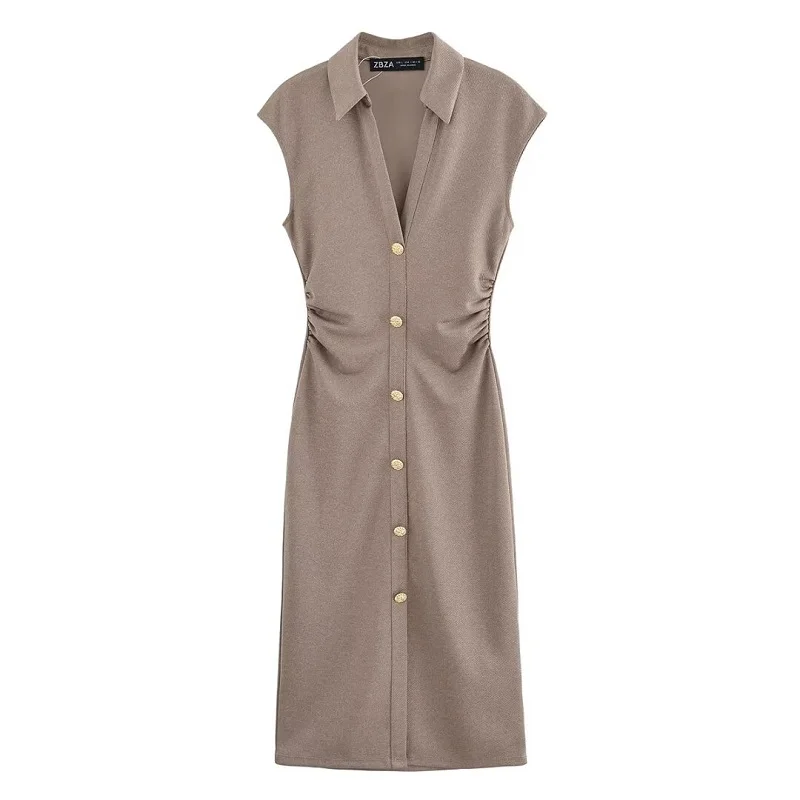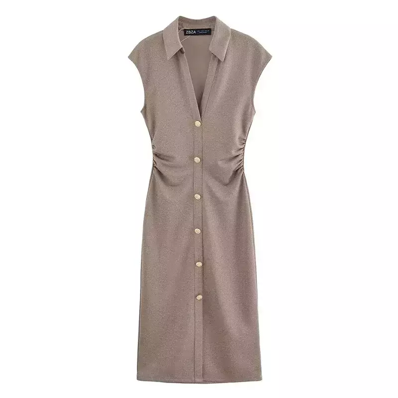 O destaque fica por conta dos detalhes refinados: a gola clássica estilo camisa e o decote em V conferem um ar moderno e atemporal. A fileira de botões dourados frontais, além de funcionais, adiciona um toque de glamour e contraste. O plissado sutil na região da cintura cria um efeito drapeado que disfarça imperfeições e define a silhueta com maestria.